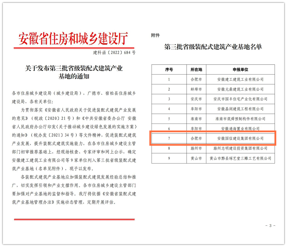 9月26日,安徽省住建厅发布了第三批省级装配式建筑产业基地名单,共9家单位入选,国信集团榜上有名。