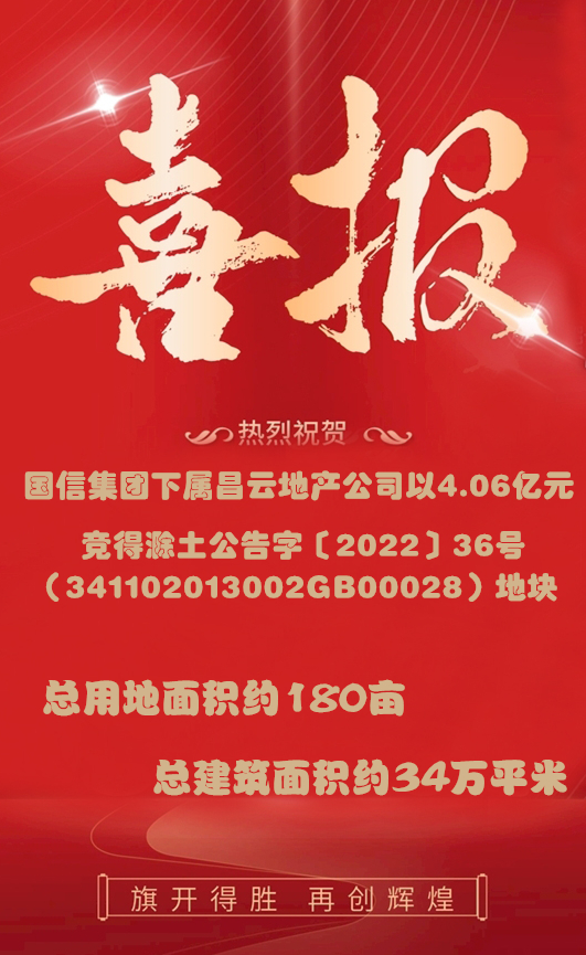 11月25日,国信集团下属合肥昌云房地产开发有限公司通过挂牌出让程序,以总价4.06亿元成功竞得滁州市滁土公告字〔2022〕36号(341102013002GB00028)地块,作为安置房代建使用。