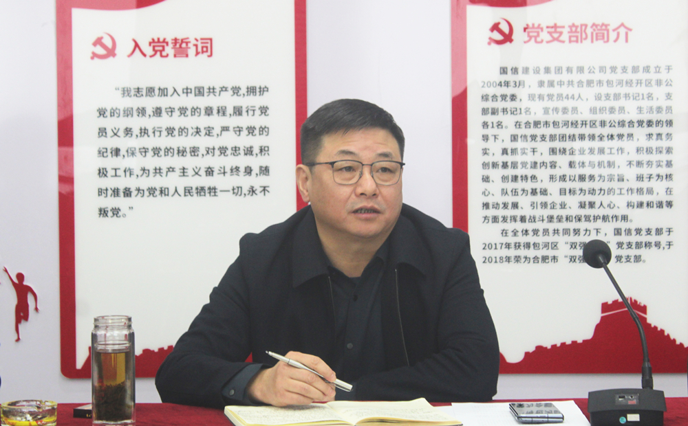 会上,党支部书记、董事长周先玉代表党支部向全体党员报告了2022年度党支部工作开展情况,对党支部存在的问题进行检视剖析,对下一步党建工作进行了谋划。指出一年来,国信集团党支部深入学习贯彻党的二十大精神,全面落实新时代党的建设总要求,推动党建工作与生产经营深度融合,以高质量党建引领高质量发展。要求全体党员继续以学习贯彻党的二十大精神为主线,以习近平新时代中国特色社会主义思想为指导,持续加强党建和发展的融合,推动企业高质量发展,为全面建设社会主义现代化国家再作新的更大贡献。