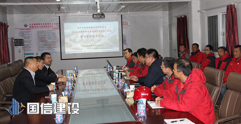 11月18日,国信集团董事长周先玉、总经理何学松一行四人,来到北京城建通州棚户区改造项目施工现场考察学习。现场常务副经理王恒详细介绍了该工程进展情况;总指挥罗岗对周先玉一行的到来表示热烈欢迎,介绍了北京城建近年来的辉煌业绩,希望双方能加强合作,共建双赢。周先玉介绍了国信的发展历程,表示在目前新常态下,促进双方合作发展。