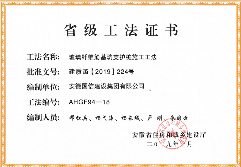 日前,由国信建设集团编制申报的《玻璃纤维筋基坑支护桩施工工法》和《承插式桥梁伸缩缝装置施工工法》两项工法顺利通过安徽省住房和城乡建设厅评审,荣获安徽省2018年度省级工法,国信建设集团科技研发工作再结硕果。