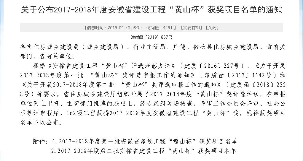 近日,安徽省住房和城乡建设厅公布了2017-2018年度安徽省建设工程“黄山杯”获奖项目名单,由国信建设集团承建的翡翠花园四期2#楼、栢景湾七期•逸湖居23#楼、东方蓝海BHJ-02-01地块-F6号楼名列榜单,获此殊荣。本次全省共有162项工程获得该奖。