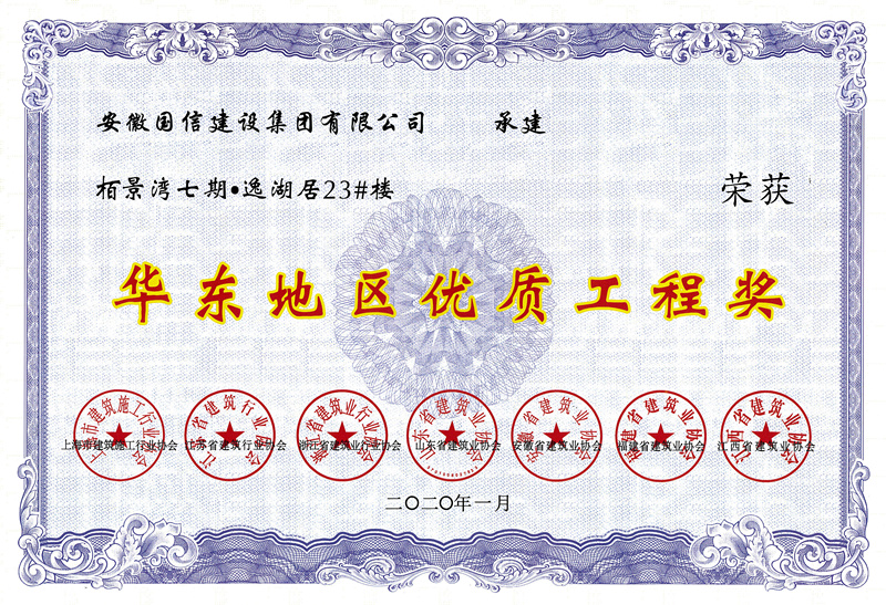 近日,由国信建设集团承建的栢景湾七期·逸湖居23#楼工程荣获华东地区各省建筑业协会联合颁发的“华东地区优质工程奖”。