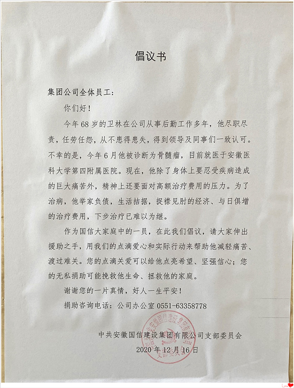 卫林是国信集团的老职工,在岗的时候,工作兢兢业业,勤勤恳恳,得到了领导及同事们的认可。本是安享晚年的他,今年下半年不幸罹患重病,治疗花费巨大,下步治疗已难以为继。国信集团党支部在得知这一情况后给予了极大地帮助和关心,立即发出爱心捐款倡议并得到积极响应,全体员工立即行动,颗颗爱心迅速汇成一股股暖流涌动,以实际行动帮助他减轻痛苦、渡过难关。